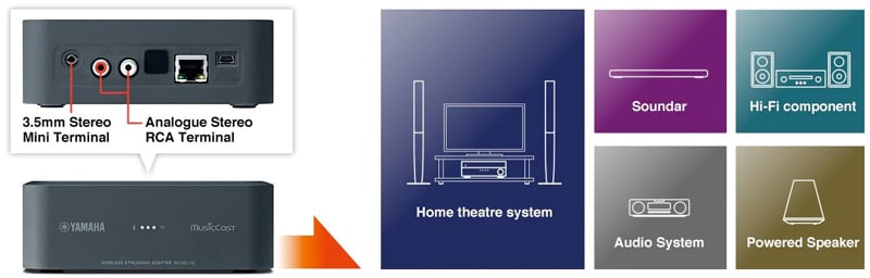 Lợi ích: Yamaha WXAD-10 có cả đầu ra RCA stereo và jack 3.5mm, giúp bạn kết nối thiết bị này với hệ thống âm thanh hiện có một cách dễ dàng.