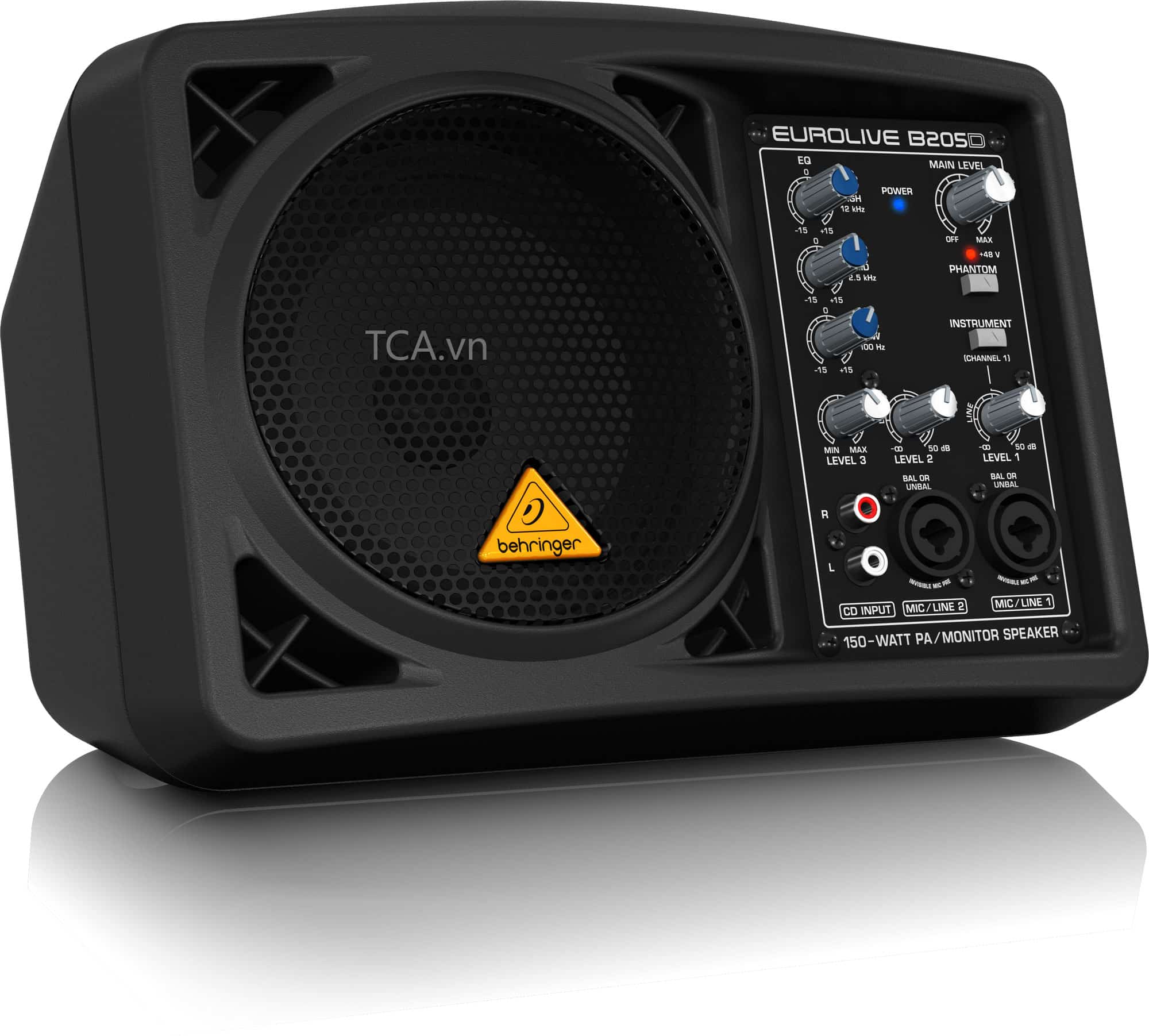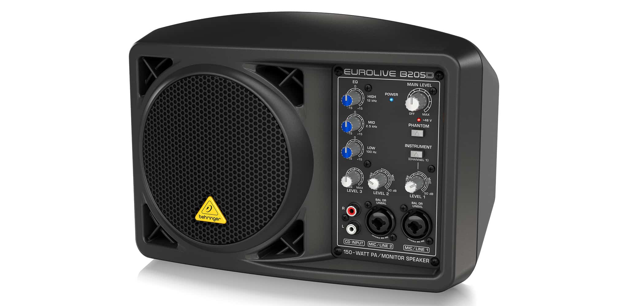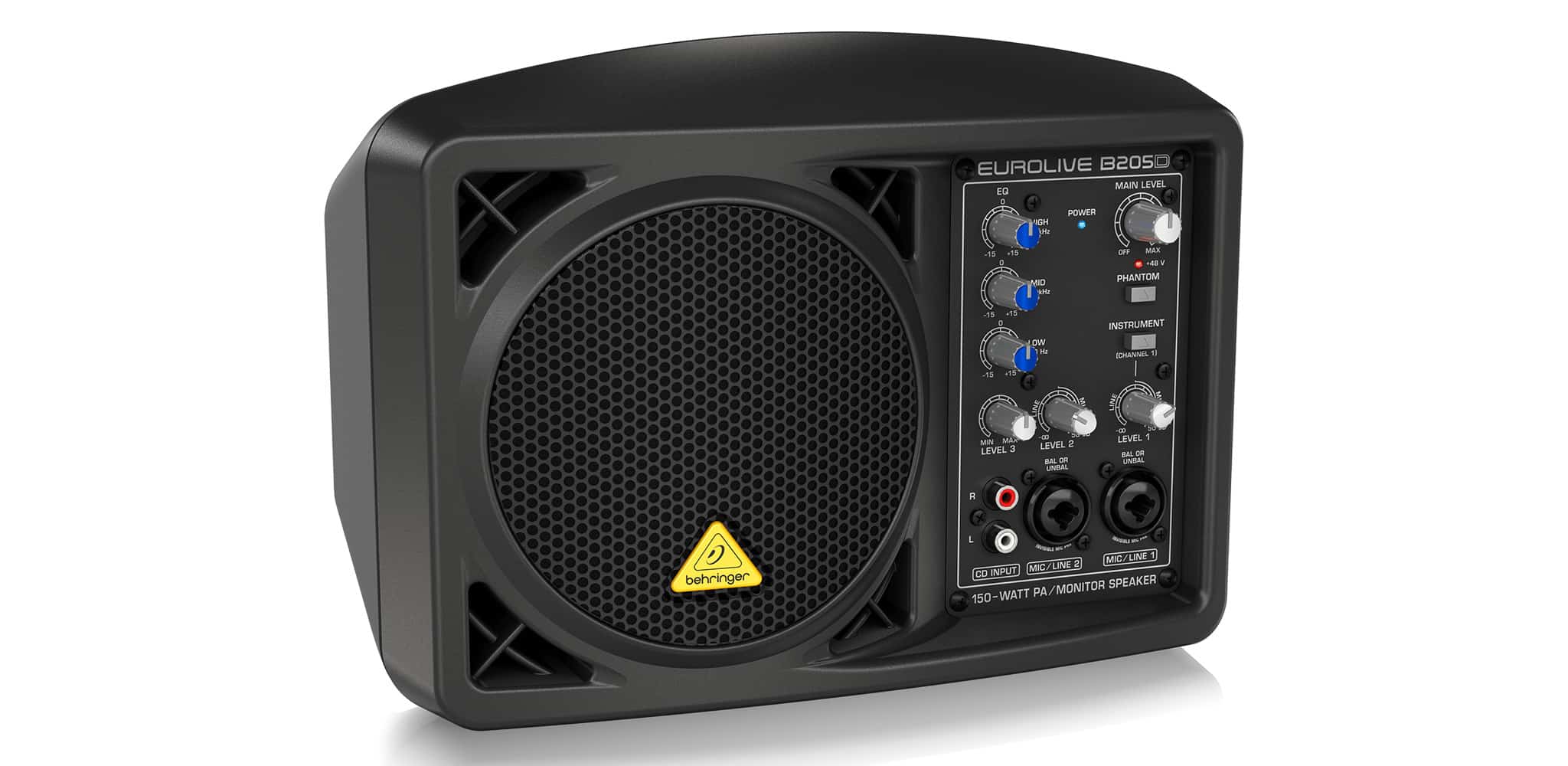 LOA MONITOR BEHRINGER EUROLIVE B205D cho phép sử dụng micro condenser nhờ nguồn phantom 48V, mở rộng khả năng ứng dụng cho thu âm cơ bản, giảng dạy, thuyết trình và biểu diễn acoustic.