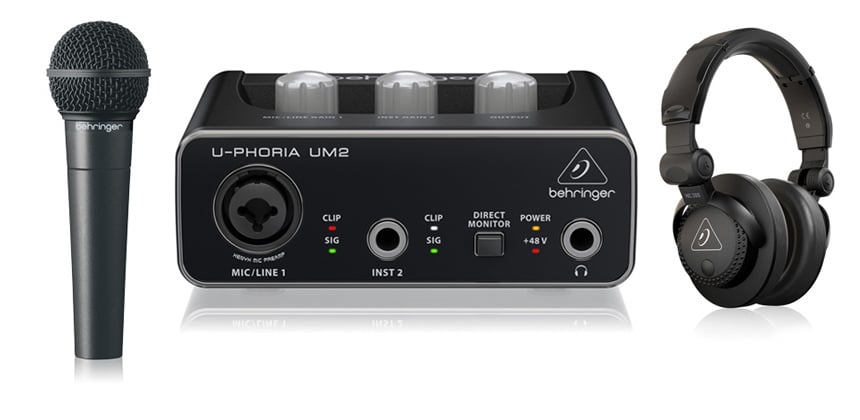 Lấy micro Behringer XM8500, soundcard U-Phoria UM2 và tai nghe HC200 ra khỏi hộp, kiểm tra phụ kiện đi kèm như dây tín hiệu XLR, dây USB và dây tai nghe.
