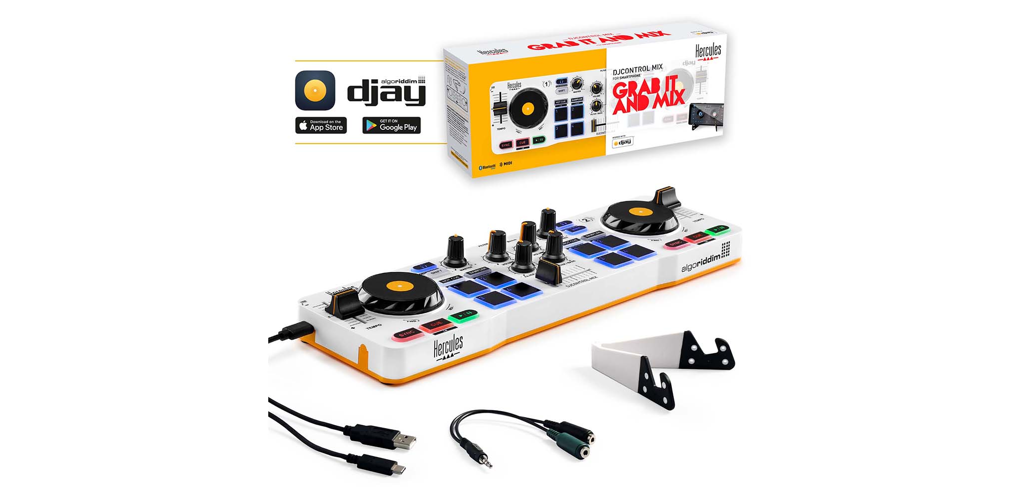 Lấy Hercules DJControl Mix ra khỏi hộp cùng các phụ kiện đi kèm: cáp USB, dây chia tín hiệu tai nghe/loa (splitter cable) và giá đỡ điện thoại.