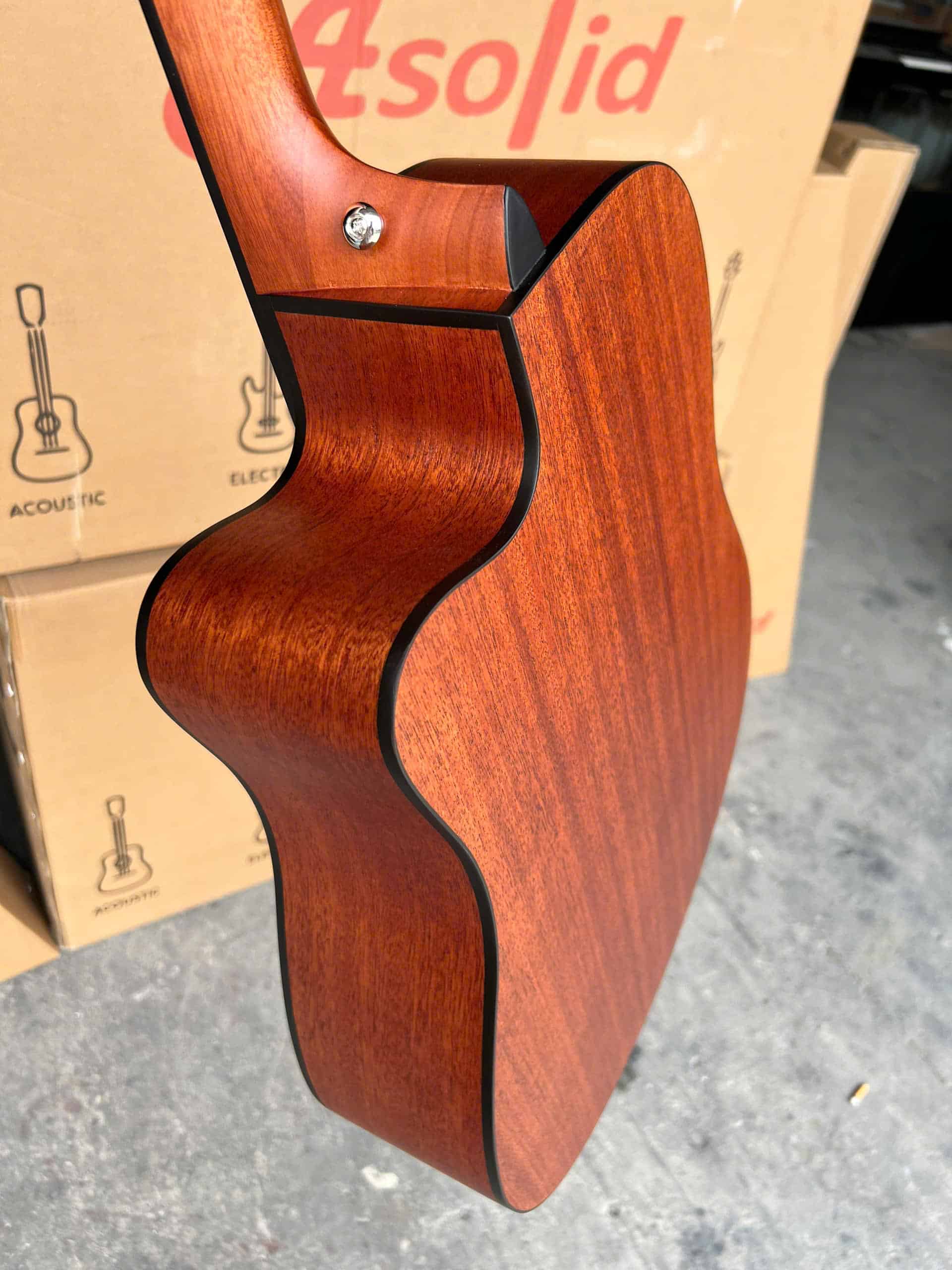 Phần lưng, hông và cần đàn bằng Mahogany là một điểm cộng lớn của Đàn Guitar ASOLID 54CD dáng D khuyết. Loại gỗ này thường được người chơi yêu thích vì mang lại màu âm ấm, trung âm rõ và rất hợp với kiểu chơi đệm hát. Nhờ vậy, khi dùng trong các bài hát có giọng hát trung tính hoặc trầm, tiếng đàn vẫn giữ được sự hòa quyện tốt mà không bị chói gắt.