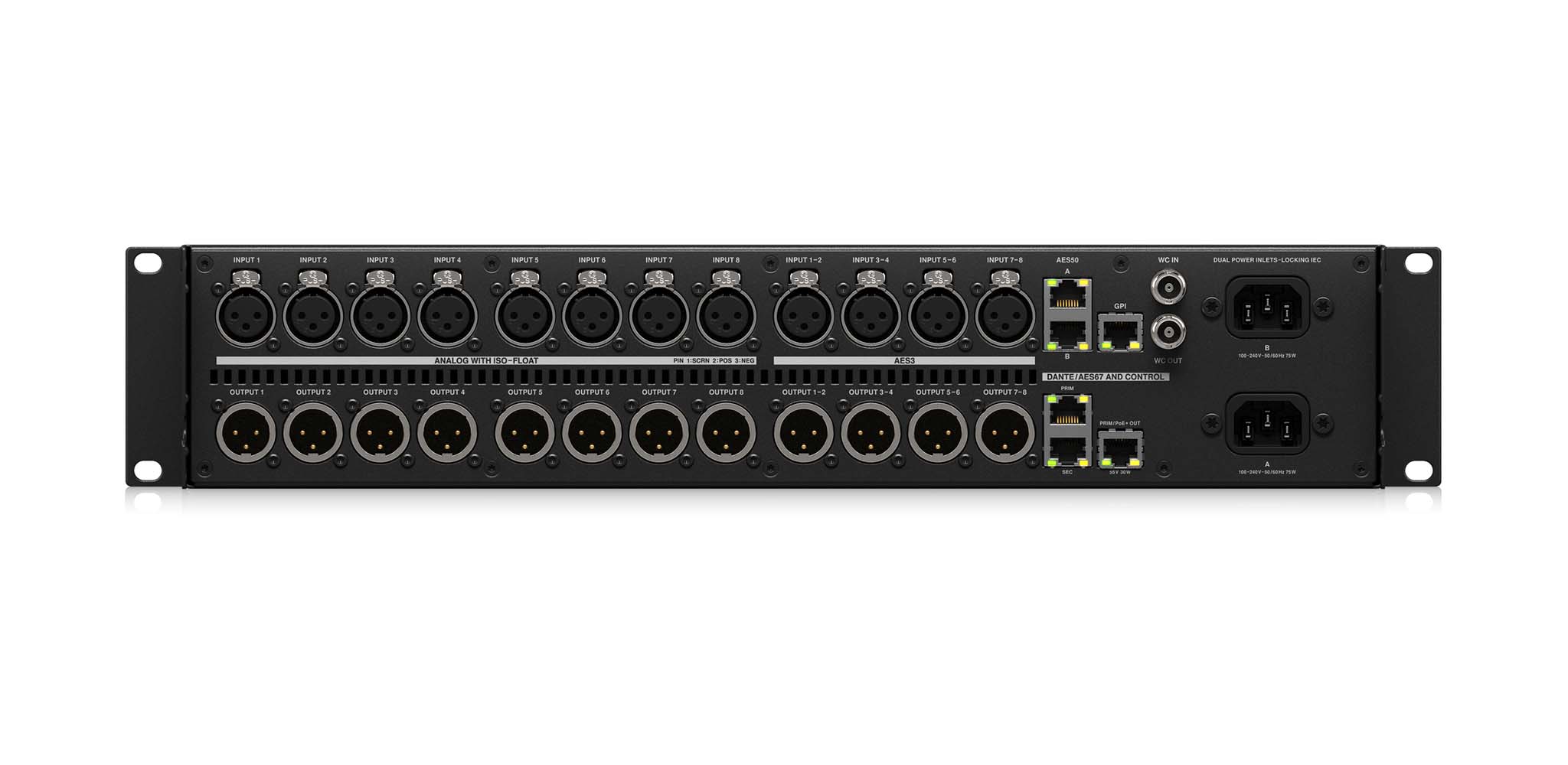 1️⃣ Hệ thống I/O mạnh mẽ 8 × 8 – cung cấp 8 đầu vào và 8 đầu ra analog, kèm theo AES3 và Dante, giúp bạn dễ dàng kết nối nhiều thiết bị trong cùng hệ thống mà không cần bộ chia tín hiệu ngoài.
