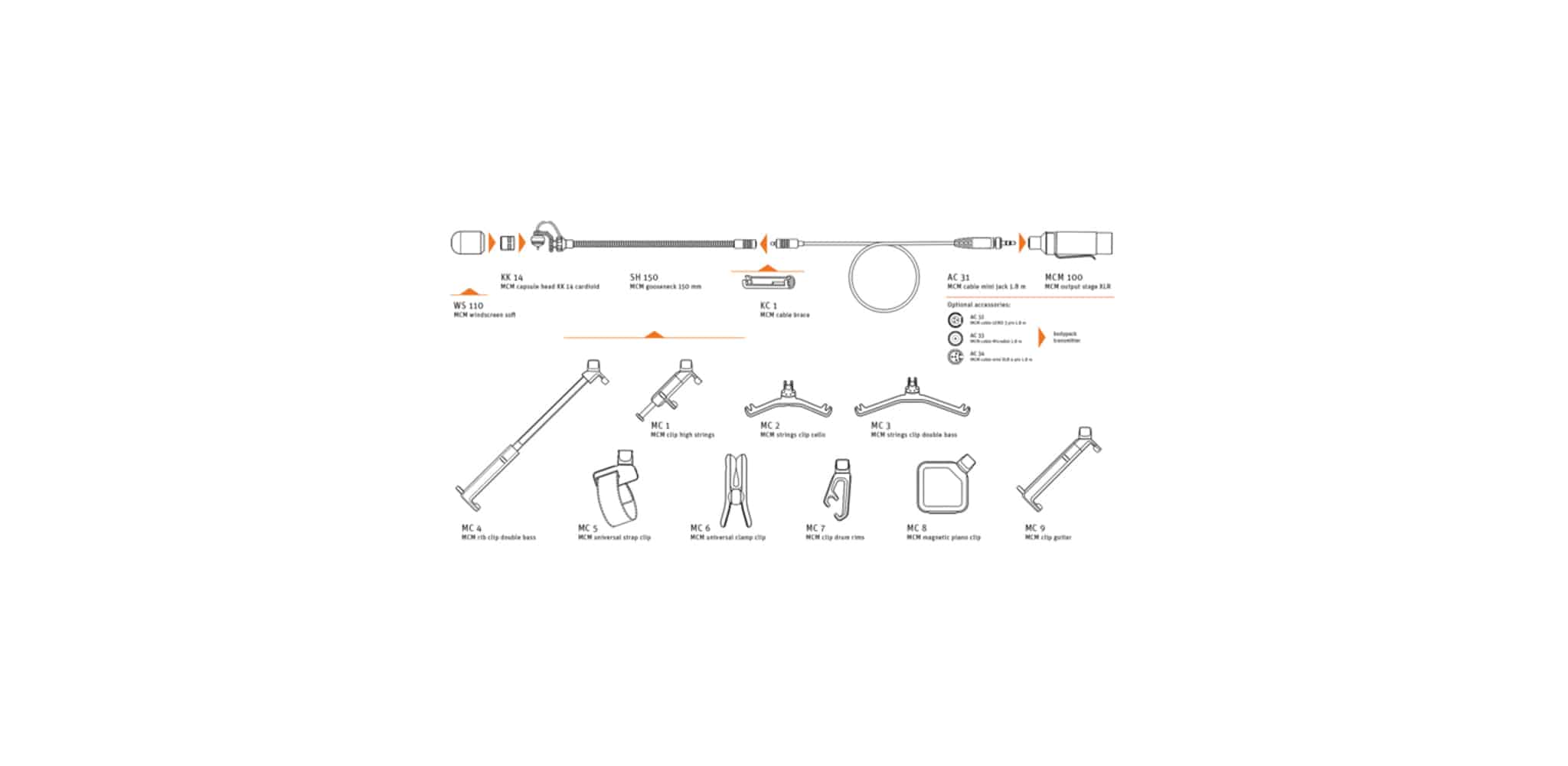 | Phụ kiện đi kèm | MCM100 Preamp, AC31 Cable, WS110 Windscreen, KC1 Cable Fixation, Soft Pouch |