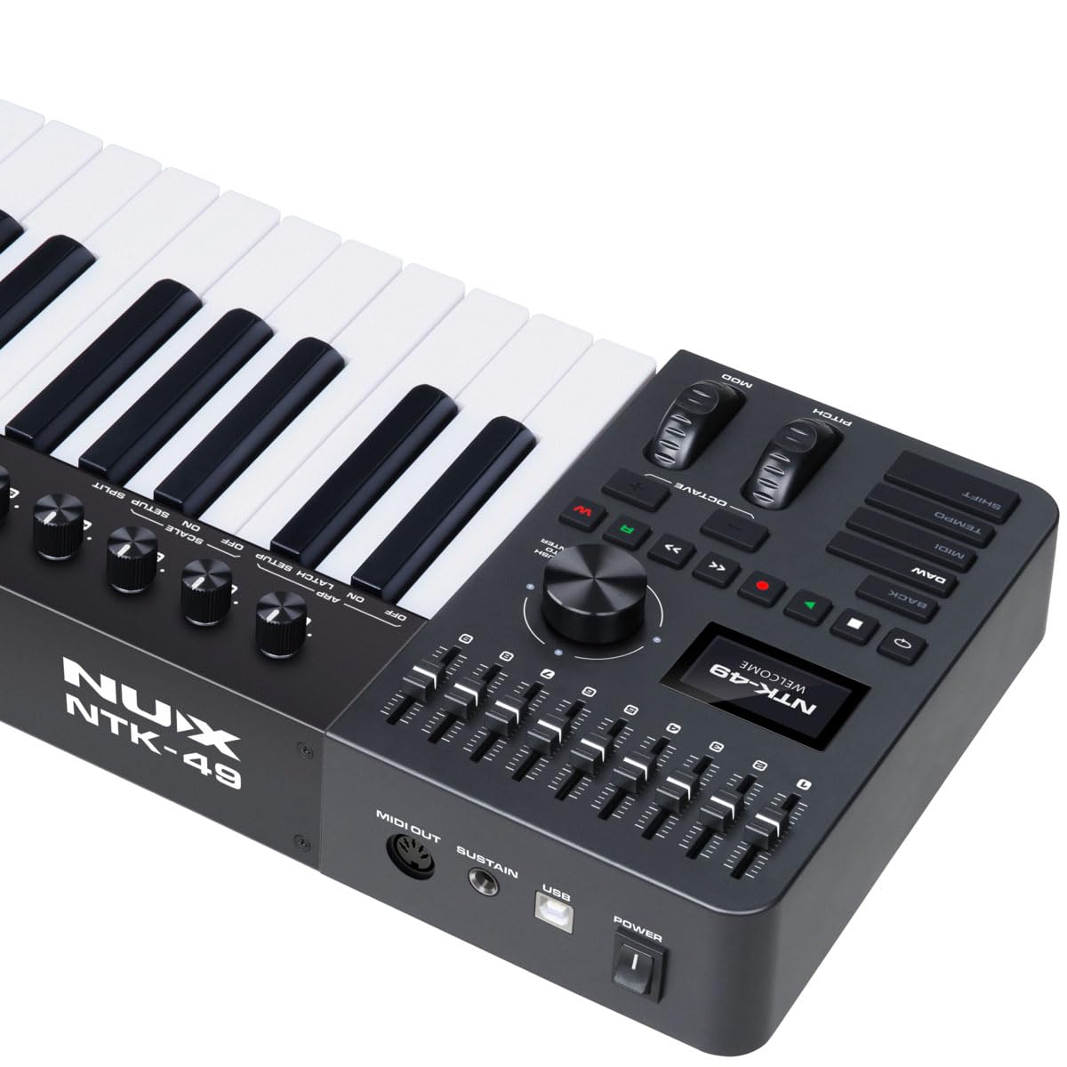 NUX NTK-49 có đầy đủ các chức năng cần thiết, bao gồm các bánh xe pitch bend và modulation, điều khiển DAW mạnh mẽ, cũng như khả năng kết nối MIDI truyền thống thông qua cổng 5-pin DIN. Với trọng lượng nhẹ và khả năng kết nối qua USB, thiết bị này dễ dàng mang theo trong các buổi biểu diễn hay sáng tạo âm nhạc tại nhà.