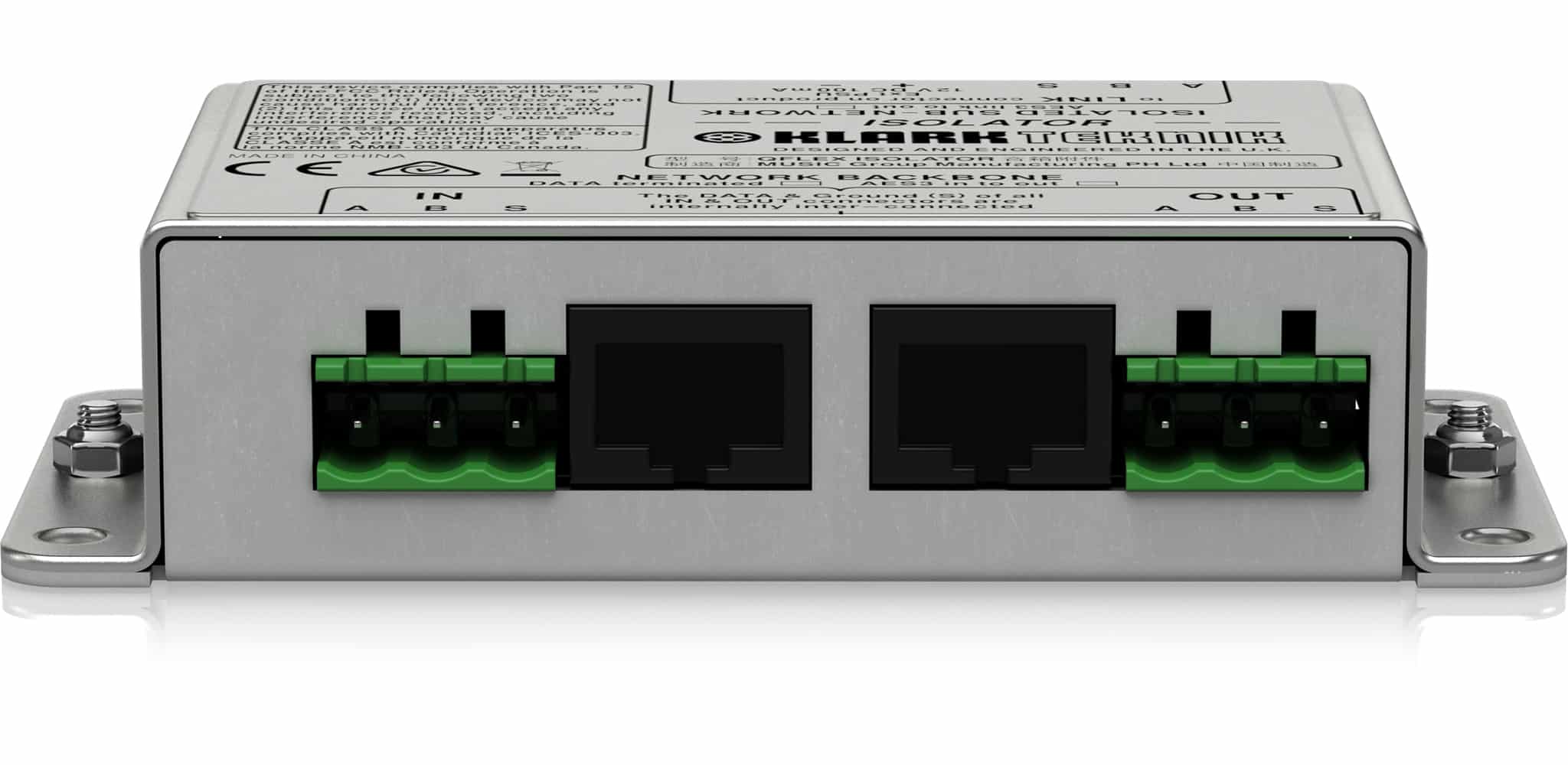 Vỏ kim loại của thiết bị có một điểm nối đất (Earth terminal). Hãy nối điểm này với hệ thống nối đất chính để đảm bảo cách ly hiệu quả và tránh tích điện tĩnh. Sau khi lắp, kiểm tra tín hiệu mạng bằng phần mềm điều khiển Klark Teknik VNET để xác nhận các node đã nhận dữ liệu ổn định.