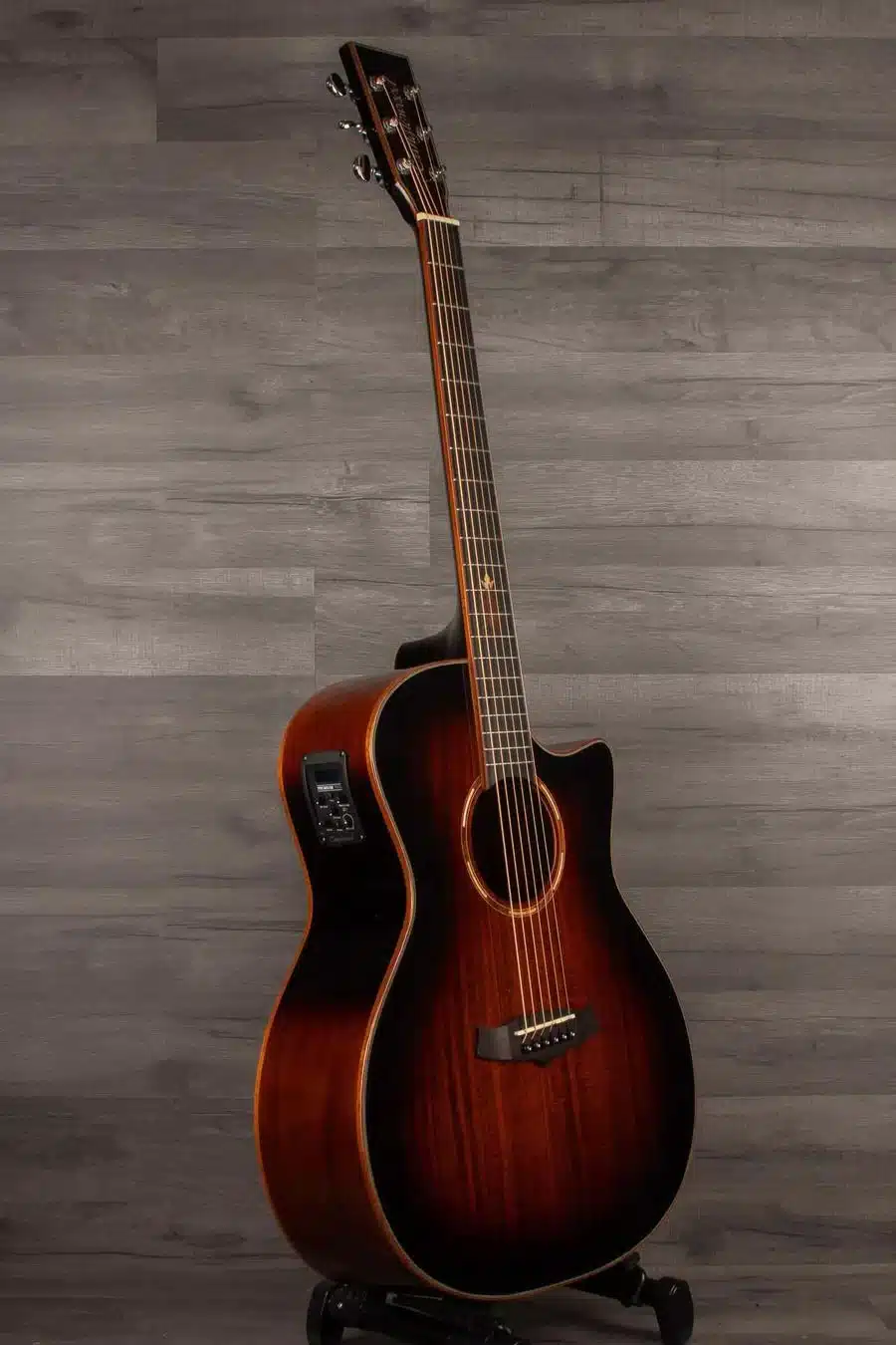 Tanglewood TWX6CEK là mẫu đàn guitar acoustic điện thuộc dòng Winterleaf Exotic, thiết kế dáng Grand Auditorium có cắt khuyết Venetian giúp lên dây dễ, ôm người và cân bằng giữa âm lượng – độ thoải mái. Điểm nhấn của Tanglewood TWX6CEK nằm ở cấu trúc mặt top gỗ mahogany nguyên tấm (solid) phủ veneer koa sang trọng; lưng & hông koa cho chất âm sáng, rõ, giàu chi tiết ở dải trung – cao nhưng vẫn ấm áp ở phần trầm. Cần đàn nato ghép dovetail chắc chắn, phím Eboncore mịn bền, cầu ngựa Techwood, nut & saddle Nubone, khoá Grover (chrome) ổn định giúp TWX6CEK giữ dây tốt, phản xạ nhanh và truyền rung hiệu quả.