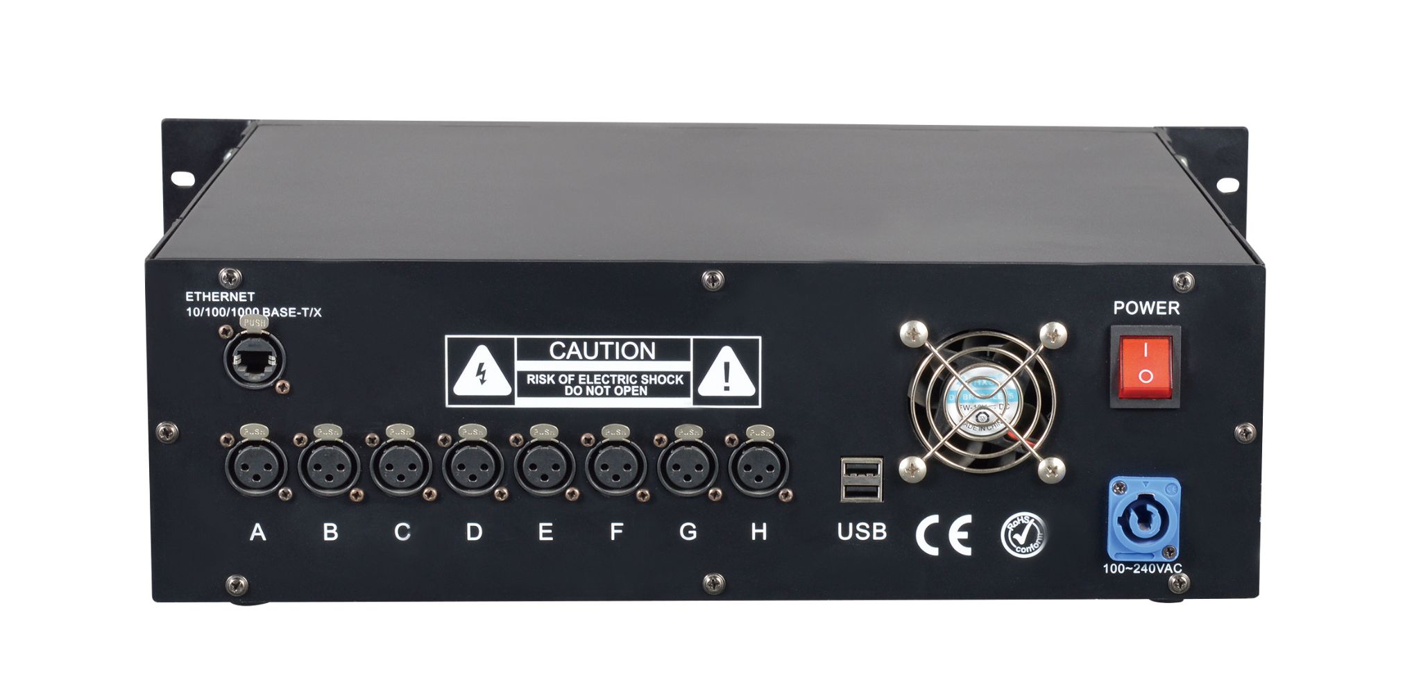 Tùy phiên bản. Thiết bị có bản 8 cổng DMX và bản mở rộng lên 12 cổng. Bạn có thể chọn tùy theo quy mô hệ thống ánh sáng.