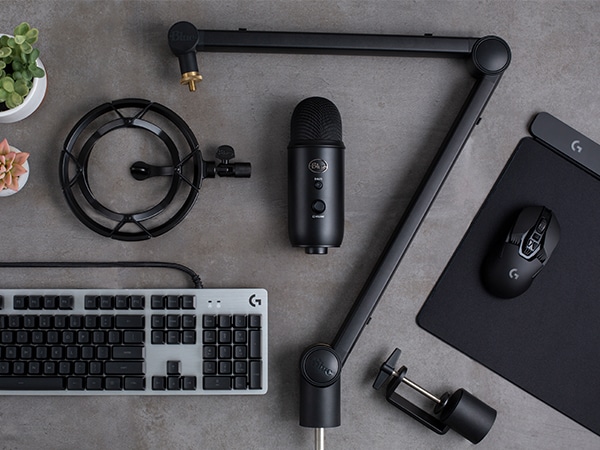 Blue Yeticaster USB mang lại âm thanh chuyên nghiệp ngay cả khi quay video ngay tại nhà. Shock mount giảm tiếng ồn từ bàn, boom arm giúp giữ micro ngoài khung hình nhưng vẫn thu âm chính xác.
